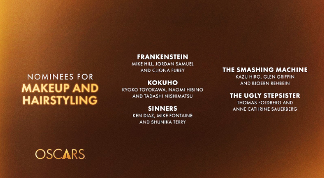 E nenhuma categoria teve mais surpresas que a de Melhor Maquiagem e Cabelo. Favoritos como “A Hora do Mal” e “Wicked: Parte 2” ficaram de fora, dando espaço ao body horror (terror corporal) de “A Meia-Irmã Feia” (produção da MUBI) e ao épico japonês “Kokuho – O Preço da Perfeição”, sobre atores de teatro kabuki. “Pecadores”, “Coração de Lutador: The Smashing Machine” e o favorito ao prêmio, “Frankenstein”, completam a lista.