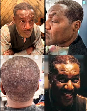 O corte de cabelo de Jordan também foi fundamental para diferenciar os gêmeos um do outro. O ator não usou peruca, deixou seu cabelo crescer por meses para deixar Terry e a maquiadora Sian Richards @sianrichardsofficial fazerem sua mágica. Por exemplo, um gêmeo com o cabelo mais volumoso, o outro com a testa mais pronunciada, um com a linha do maxilar mais marcada etc. Diferenças sutis que compõem a caracterização e fazem a diferença na tela.