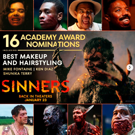 Vários departamentos técnicos de “Pecadores” foram lembrados pela Academia, e não podia faltar os líderes de Maquiagem e Cabelo do filme: Ken Diaz @thekendiaz (chefe do departamento de maquiagem – makeup department head), Michael Fontaine @mikefontaine_ (designer de maquiagem protética – prosthetic makeup designer) e Shunika Terry @shunika.terry (hair designer).